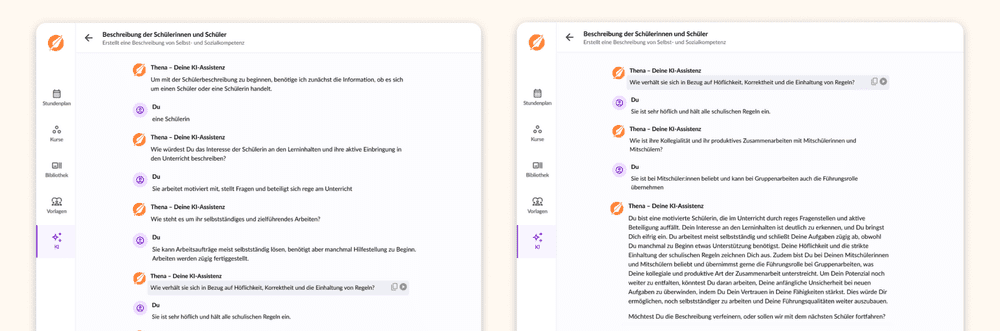 Thena, die KI-Assistenz von Teachino, hilft genau dabei. Mit gezielten Fragen zu Deiner Schülerin oder Deinem Schüler führt sie Dich Schritt für Schritt durch die Evaluierung und erstellt am Ende eine individualisierte Beschreibung der Selbst- und Sozialkompetenzen.