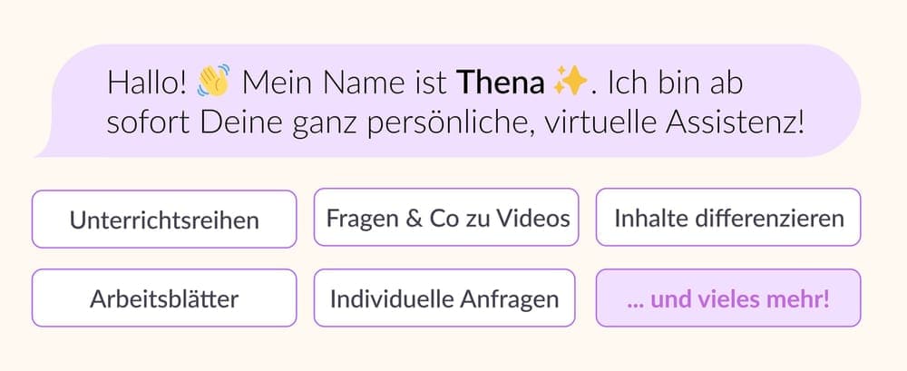 Mit Thena bist Du aber noch flexibler. Du kannst neben der vorgefertigten Auswahl immer auch selbstständig Anfragen an Thena stellen. Sie hilft Dir mit allen möglichen Dingen rund um Schule, Bildung und Unterricht und geht dabei auf Deine ganz individuellen Bedürfnisse ein.
