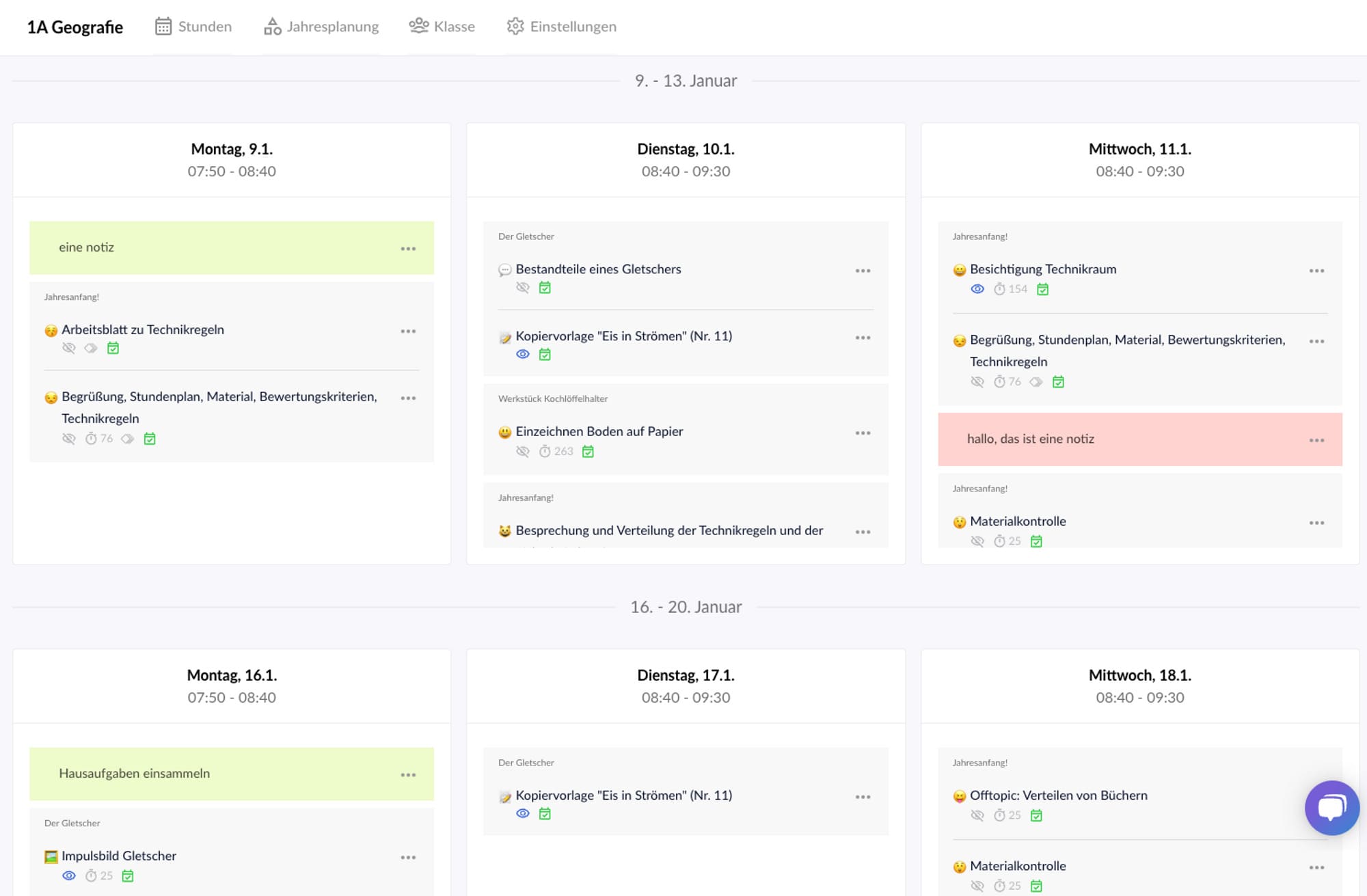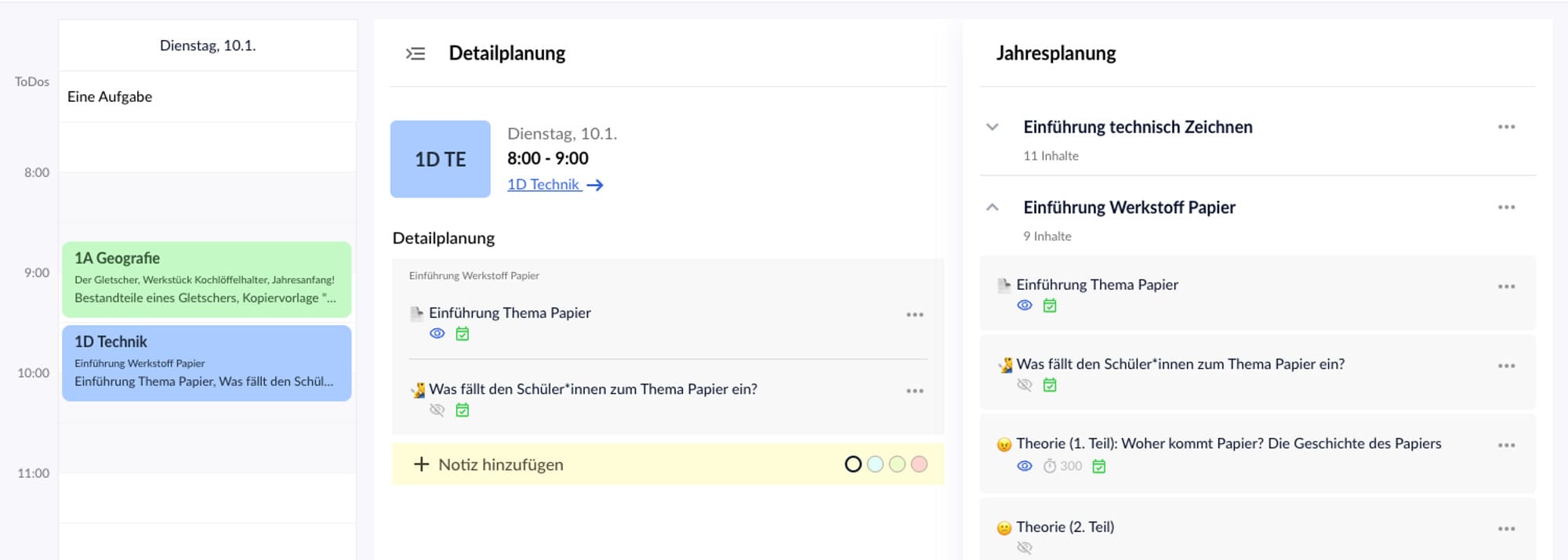 Die Detailplanung hat die größte Neuerung bekommen. Hier war uns wichtig, Dir die bestmögliche Übersicht über den Tag zu geben. Klickst Du nun auf eine Unterrichtsstunde im Stundenplan, bleibt links der Stundenplan für diesen Tag geöffnet und du kannst zwischen den Tagen und Kursen navigieren. In der Mitte siehst du groß die Planung der gewählten Stunde. Rechts befindet sich die Jahresplanung. Du kannst natürlich wie gewohnt Inhalte aus der Jahresplanung in die Detailplanung ziehen.